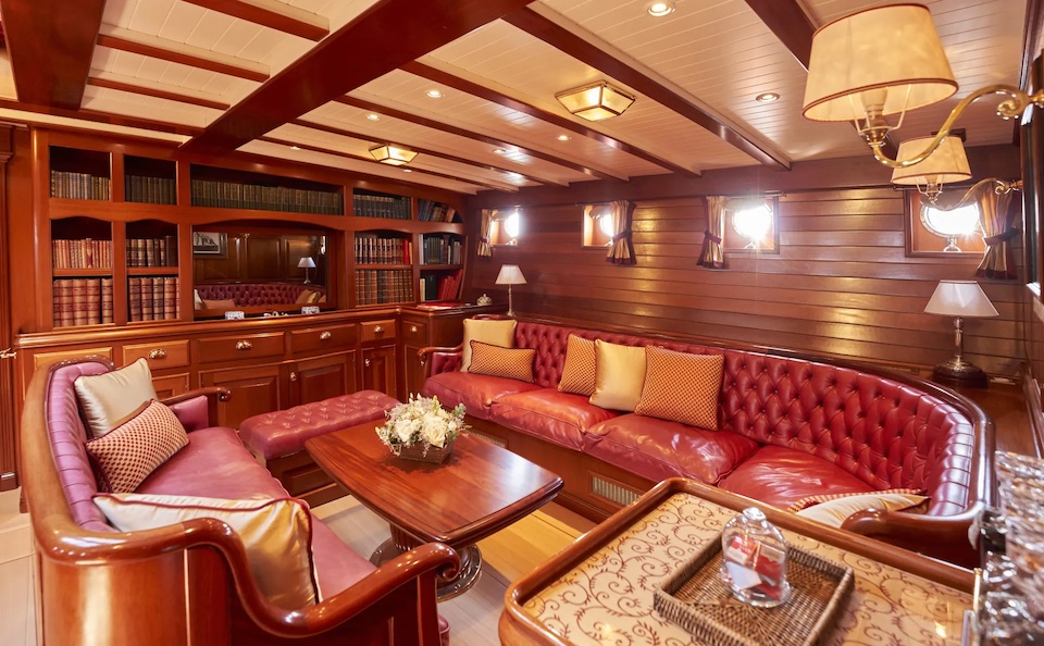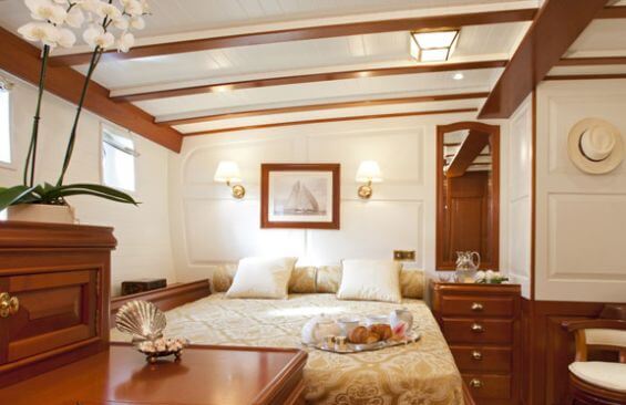 The en-suite bathrooms have separate showers and toilets and are finished with elegant period fittings. Ample hanging and cupboard space is built in, while each cabin has its own privately controlled air conditioning system as well as an iPod docking station with televisions available on request. Overhead skylights and portholes offer an abundance of natural light while below deck.