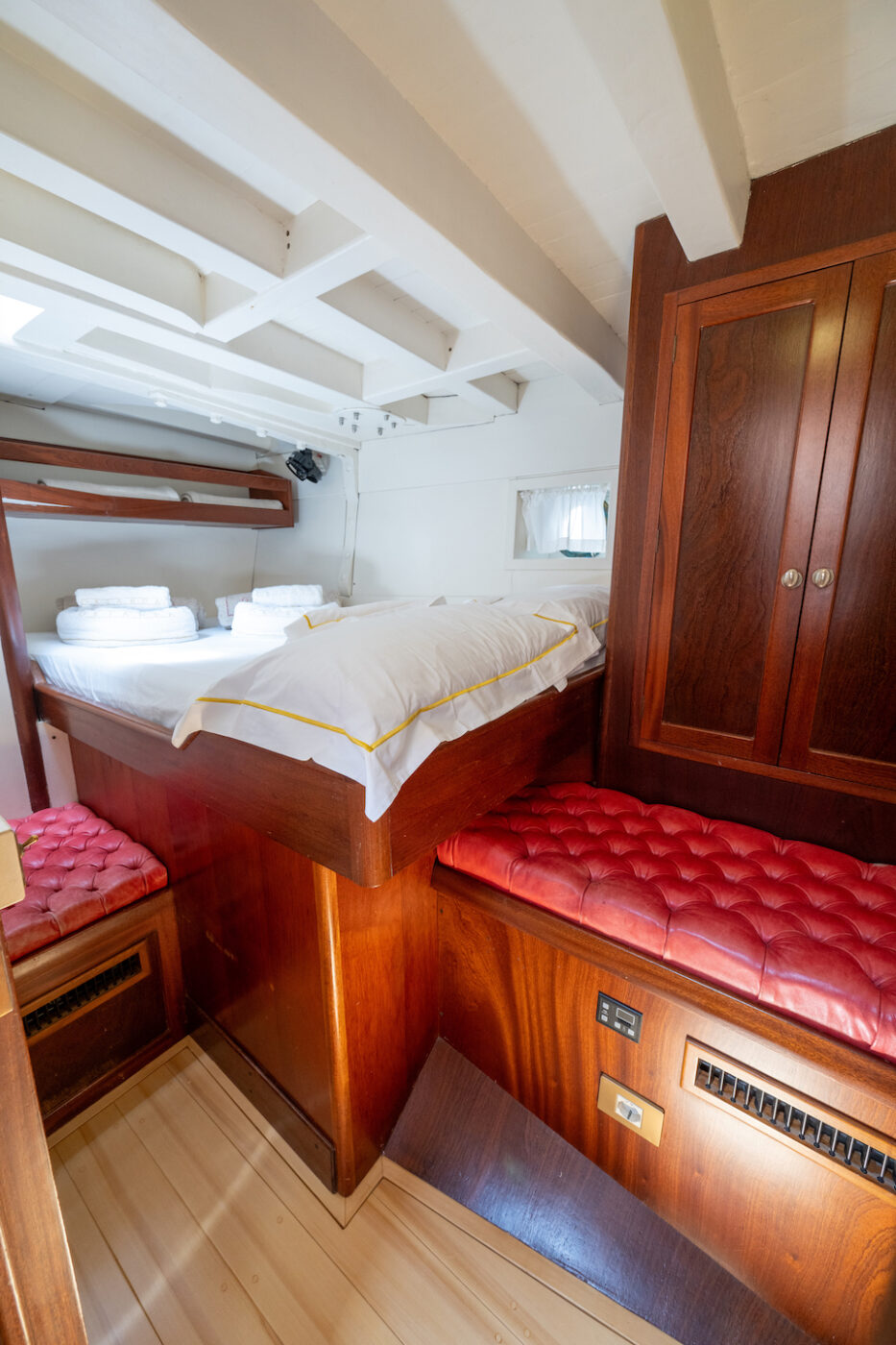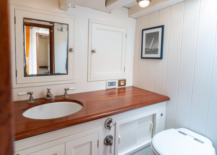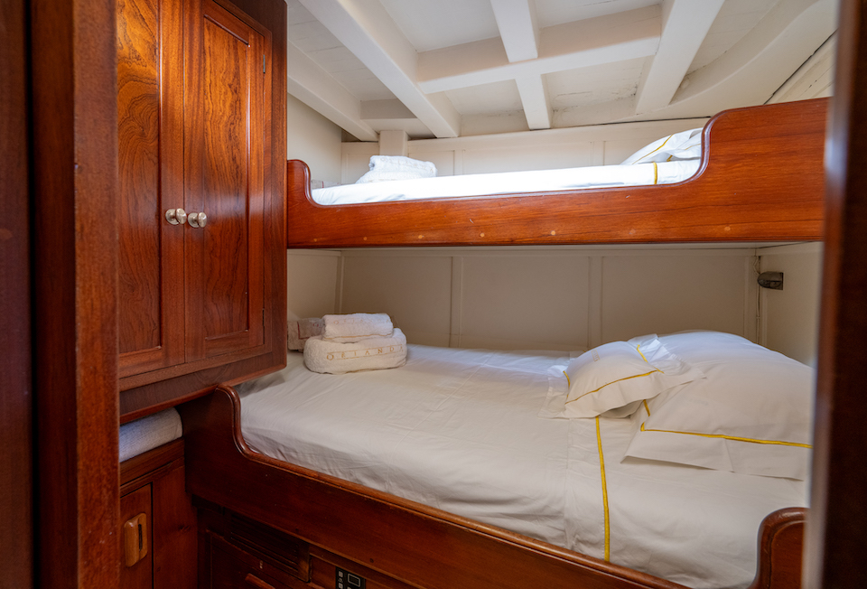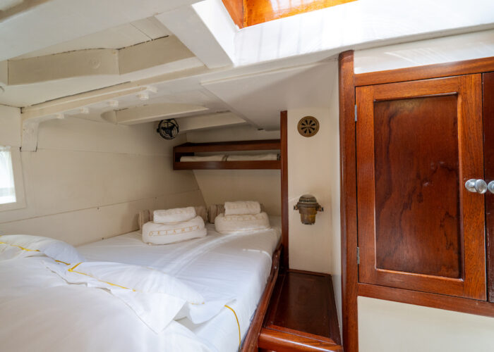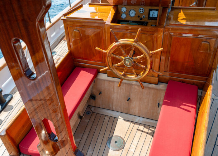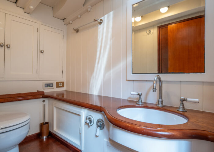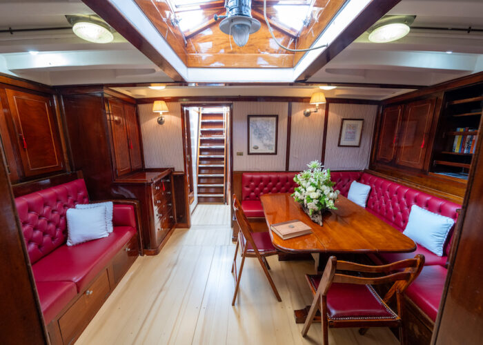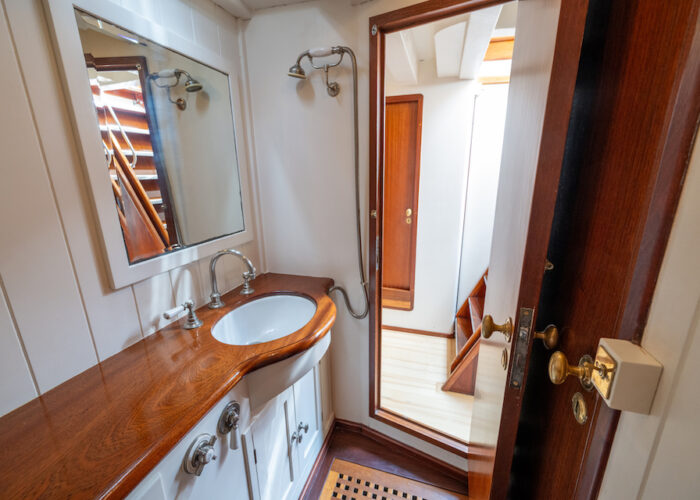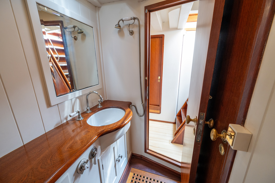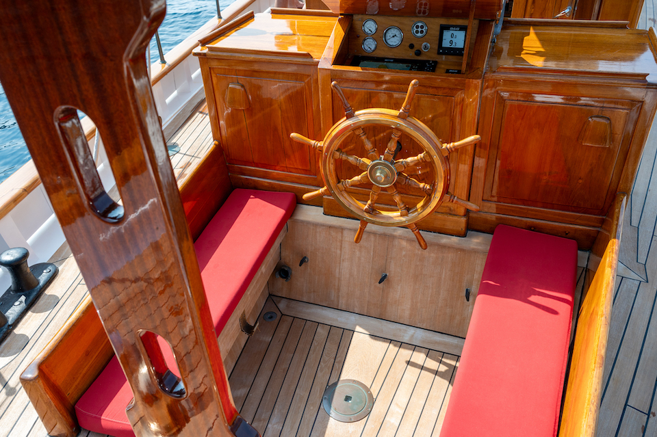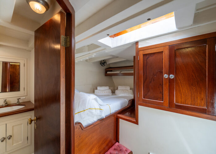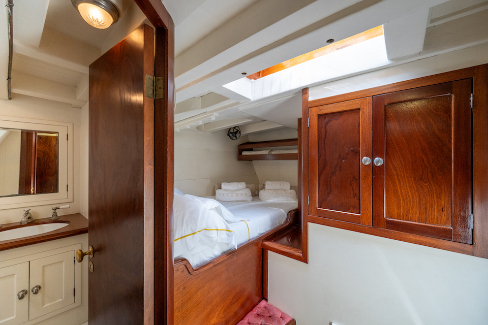 She sleeps 8 guests in 4 cabins, served by a crew of 3, offering all the comforts and safety of modern yachting without losing the charm and craftsmanship of the 1930s.