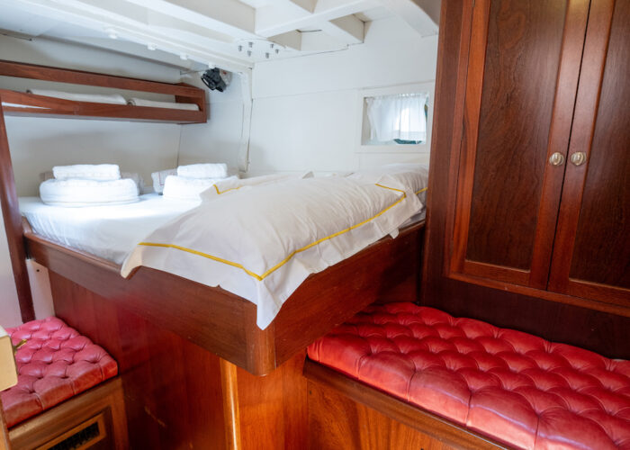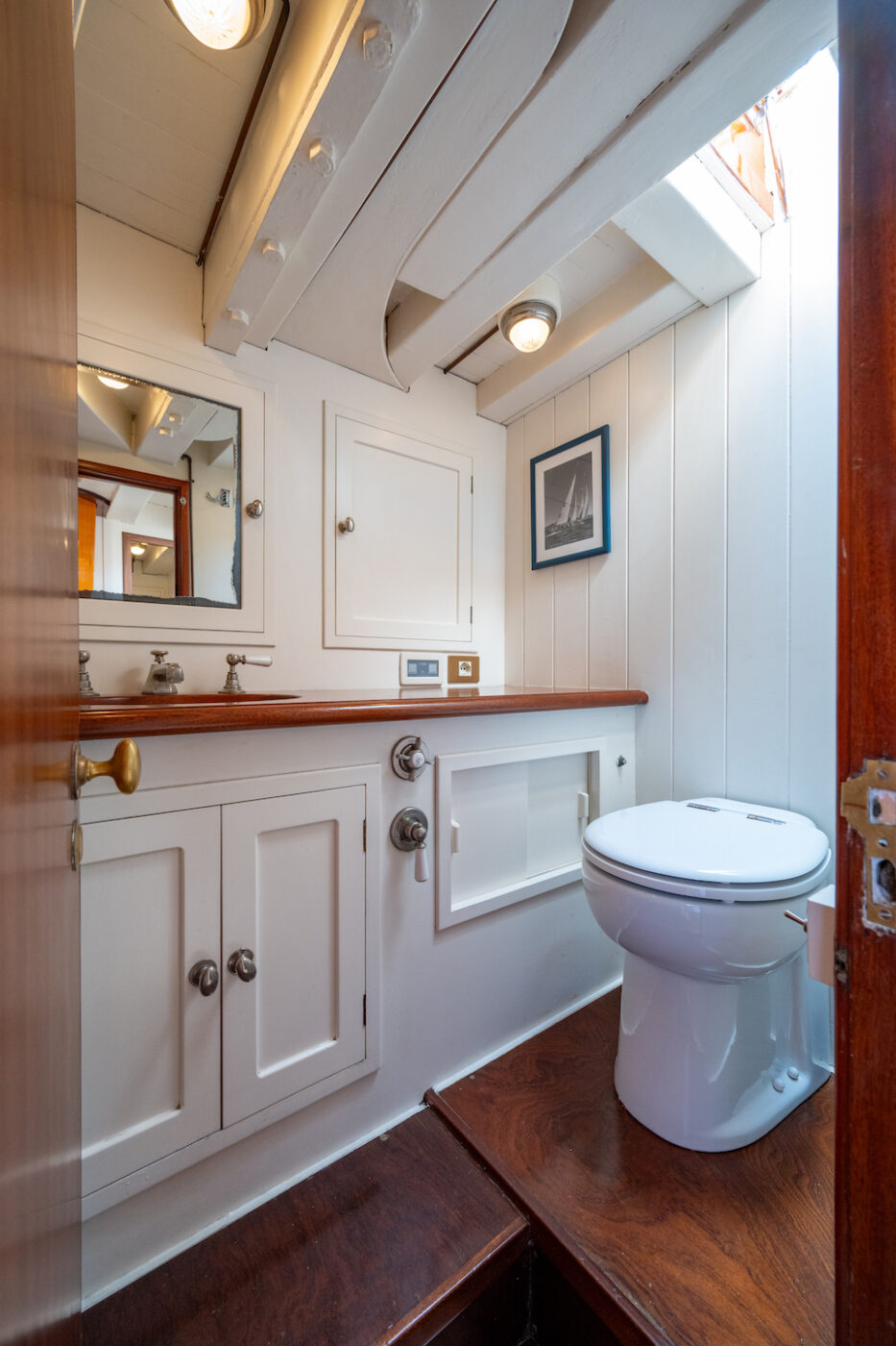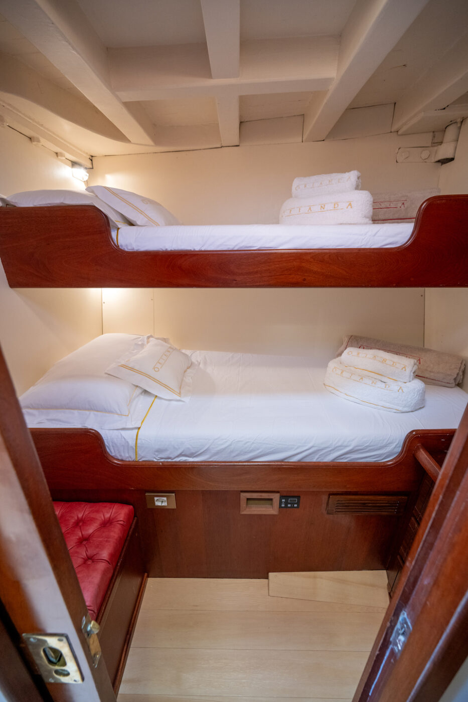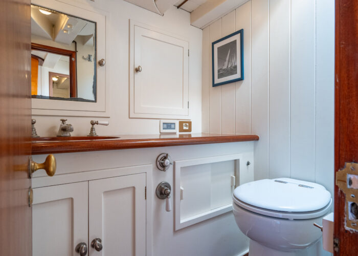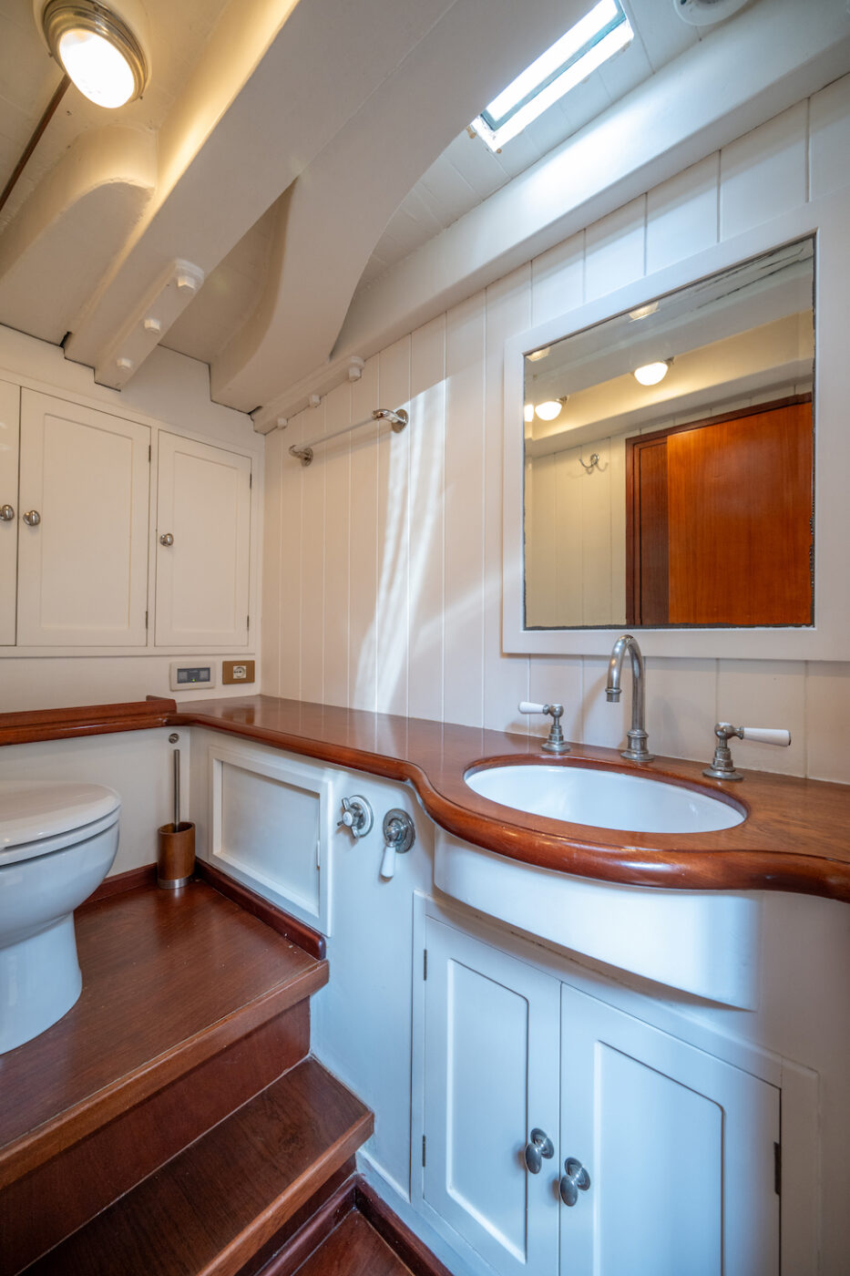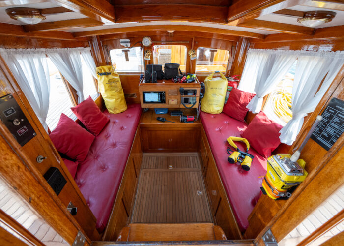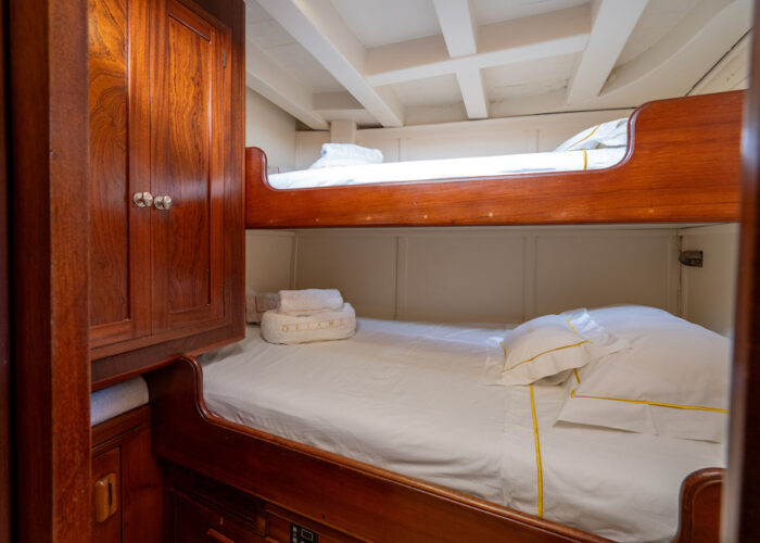 She sleeps 8 guests in 4 cabins, served by a crew of 3, offering all the comforts and safety of modern yachting without losing the charm and craftsmanship of the 1930s.