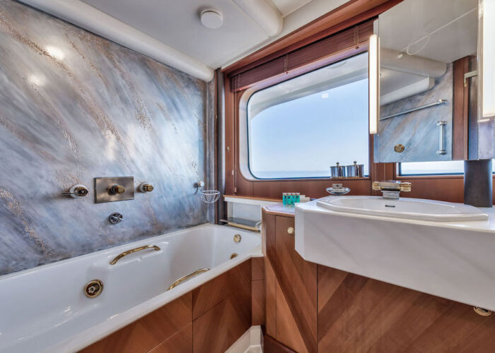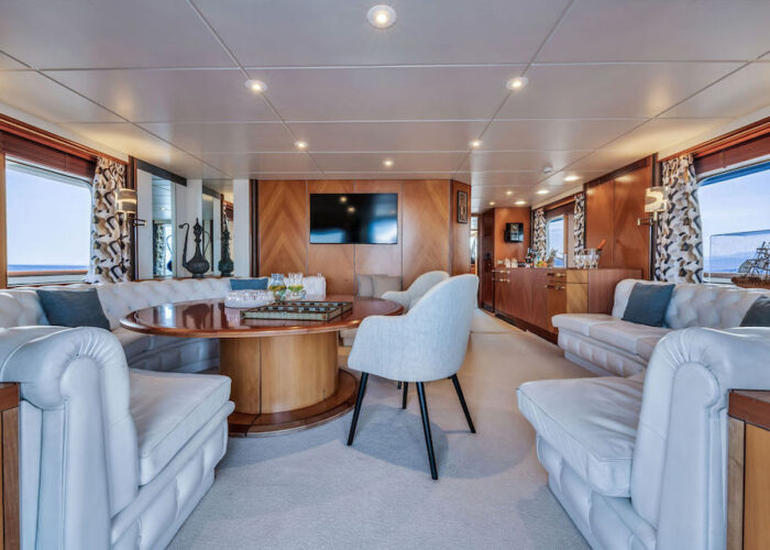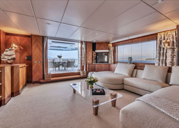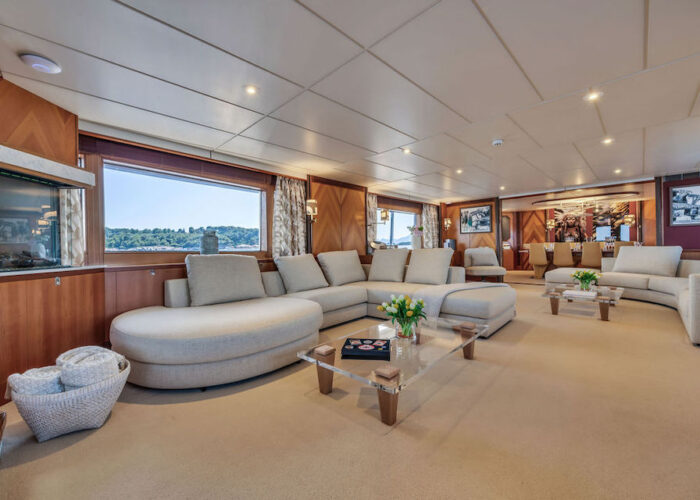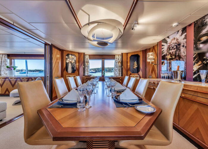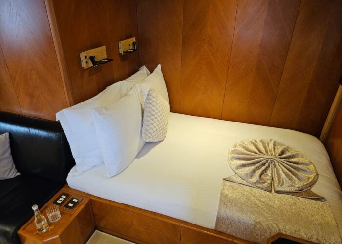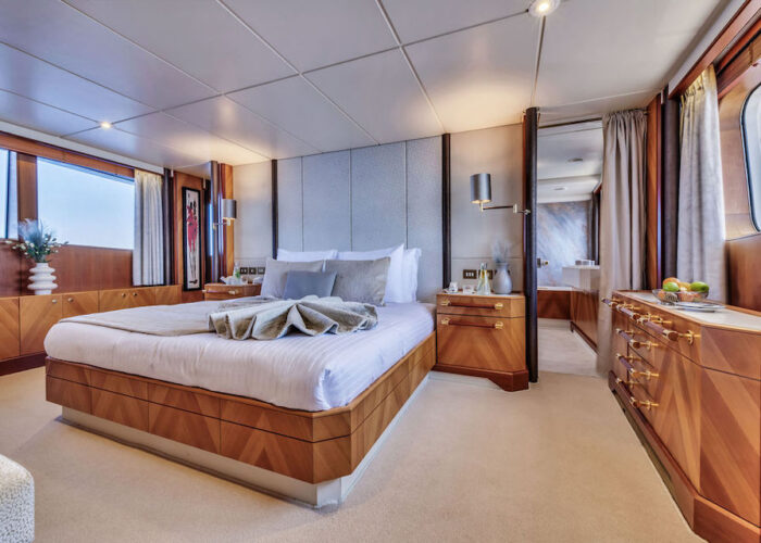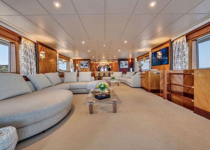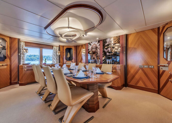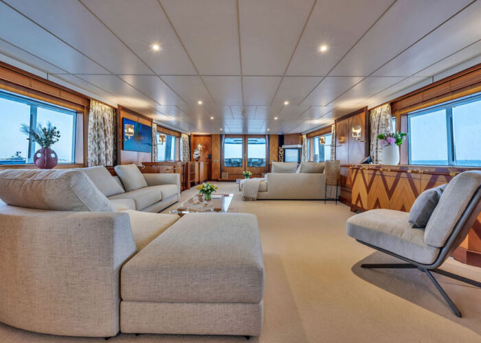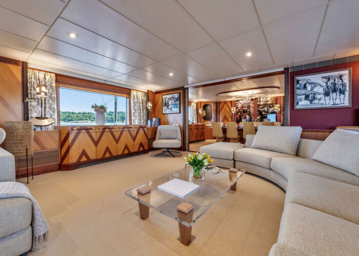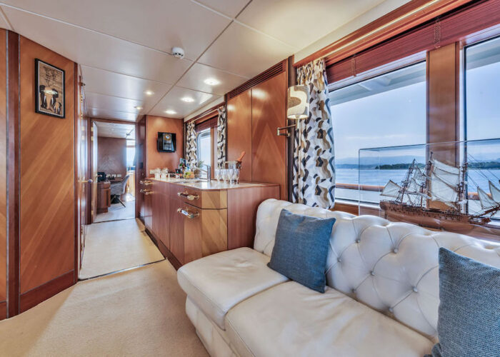 Stepping on board SHEERGOLD is stepping back in time. Her original interiors were designed by Jon Bannenberg, blending polished, herringboned pear wood with vintage African accents and gleaming brass. Plush leather Chesterfield sofas create a home-like atmosphere that instantly feels lived-in while soft ambient lighting casts a warm glow, inviting slow evenings and intimate conversation.