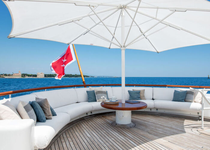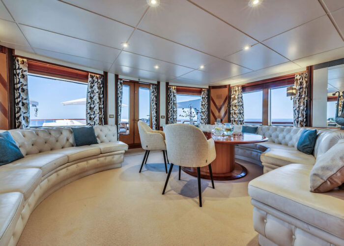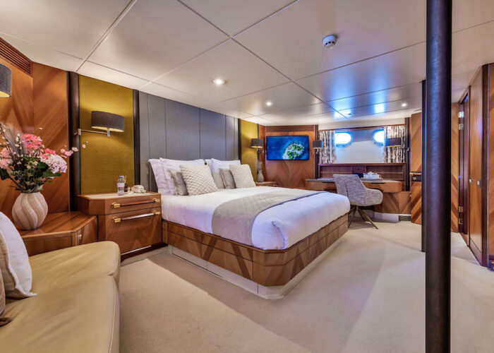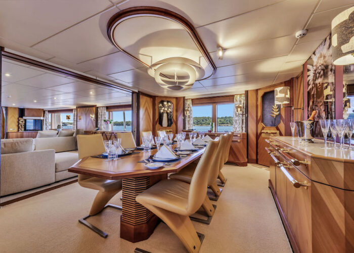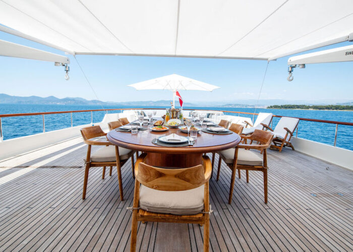 Outside, her wide, sun-warmed teak decks catch the light, particularly along her distinctive canoe stern, while awnings and parasols provide flexible shaded spaces. Both aft decks offer options for alfresco dining, while her forward sundeck commands the most stunning of views from plush sunpads, or a pair of observation settees on the main deck forward.