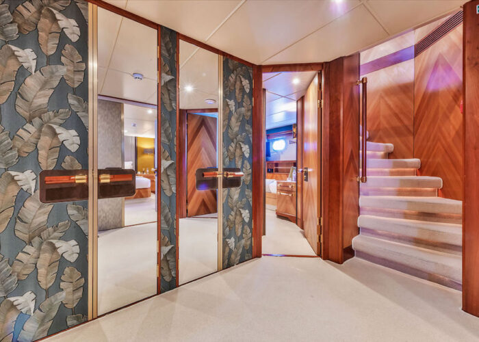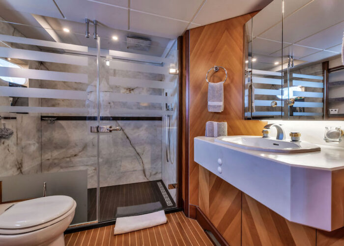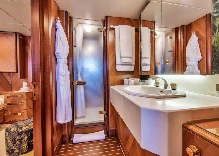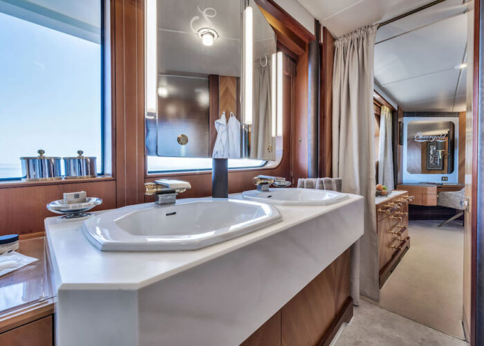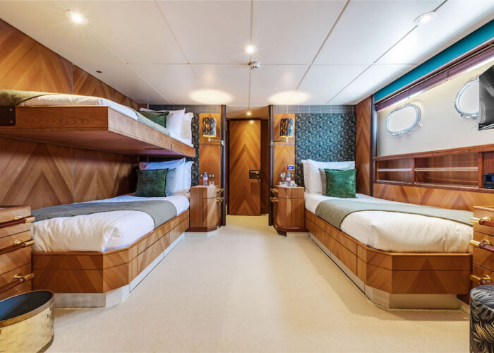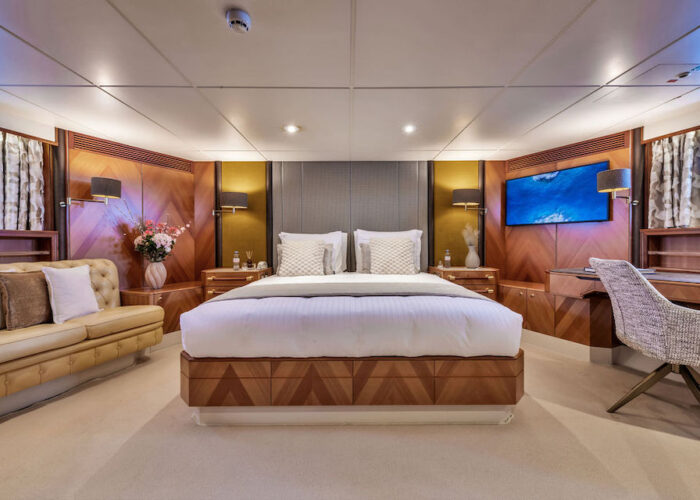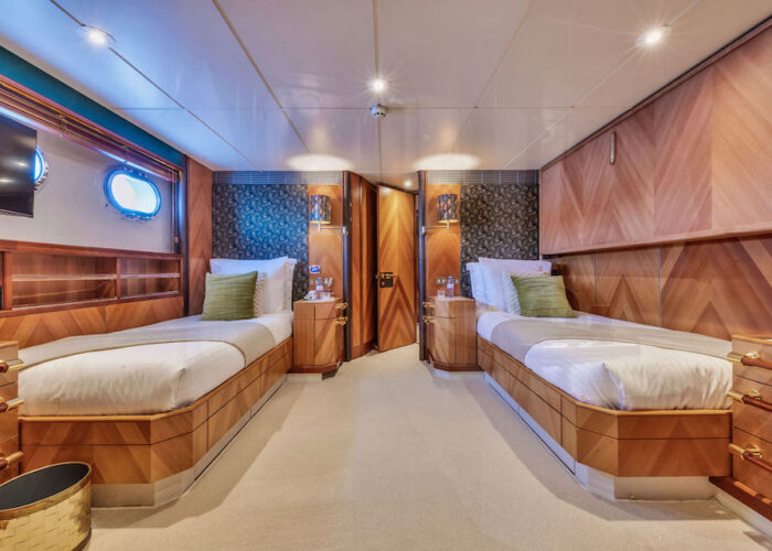 SHEERGOLD can accommodate 10 guests across four cabins. Her main cabin is full-beam and located on the main deck, with an additional double cabin and two twins.