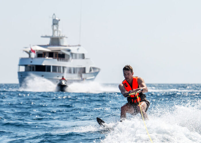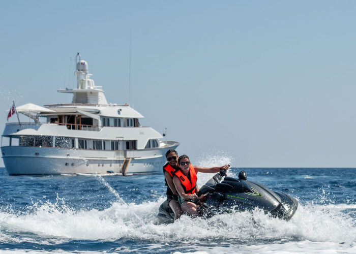 But while she may look classic, SHEERGOLD is built for adventure. With a cruising speed of 11.5 knots and a top speed of 13.5, she is ideal for unhurried days at sea—wherever that sea may be. Her heated decks make her supremely comfortable for high-latitude cruising while her breezy canoe stern is perfect for lounging under the sun. She enjoys a brand-new watertoy collection that includes e-foils, Seabobs, a towable Williams jet tender, Waverunners, paddleboards, and a modular floating platform perfect for creating your own pop-up beach club.