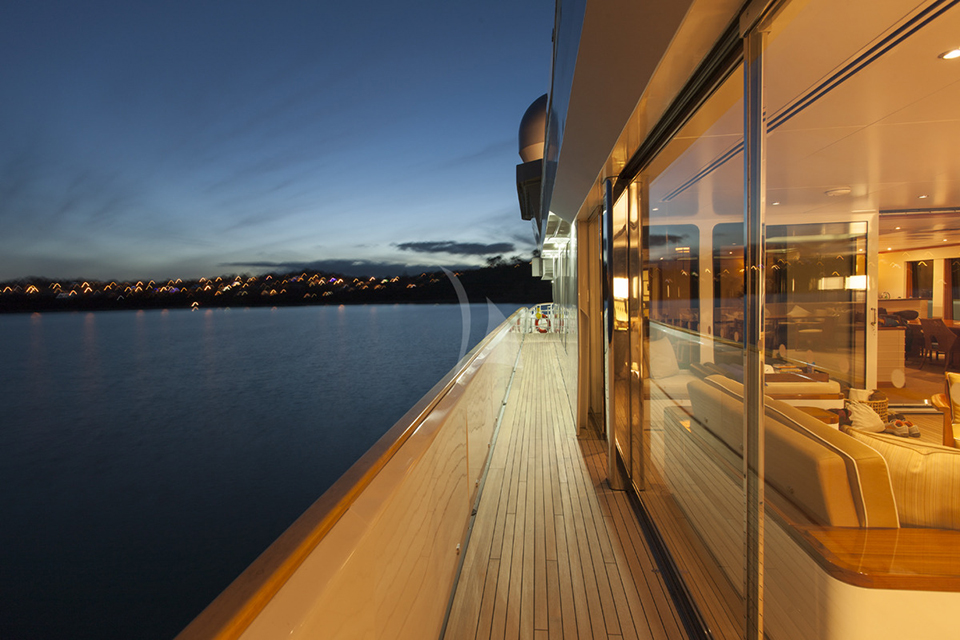 She has a glass enclosed lounge on the bridge deck overlooking the helipad, a sky lounge with bar and dining table and a Portuguese bridge forward of that. Her upper deck has a master suite with his and hers bathrooms and a private office along with four VIP suites, each with huge picture windows. A further double cabin and twin cabin on the lower deck complete accommodation for 12 in seven guest cabins and 20 crew attend to your every need.