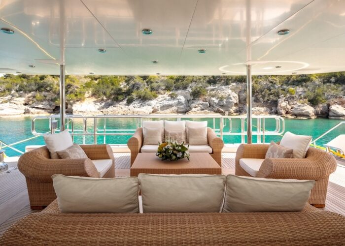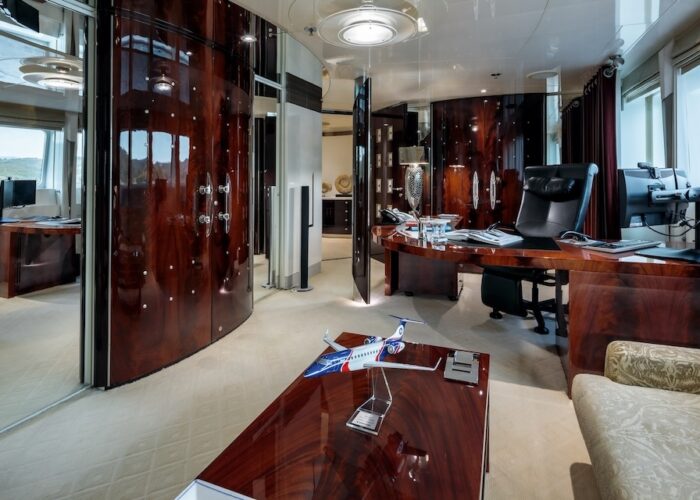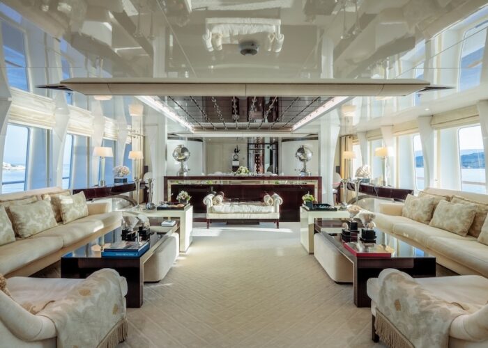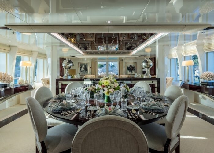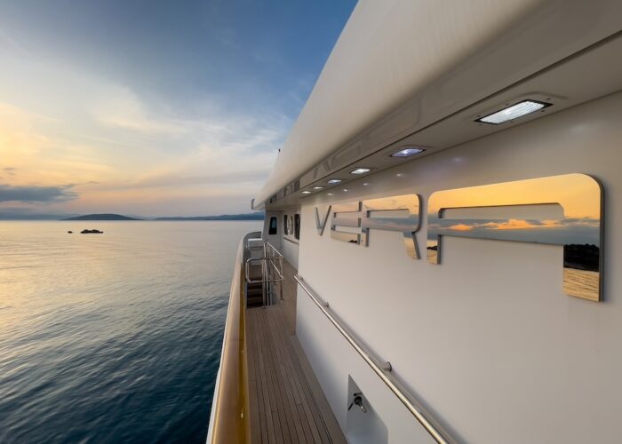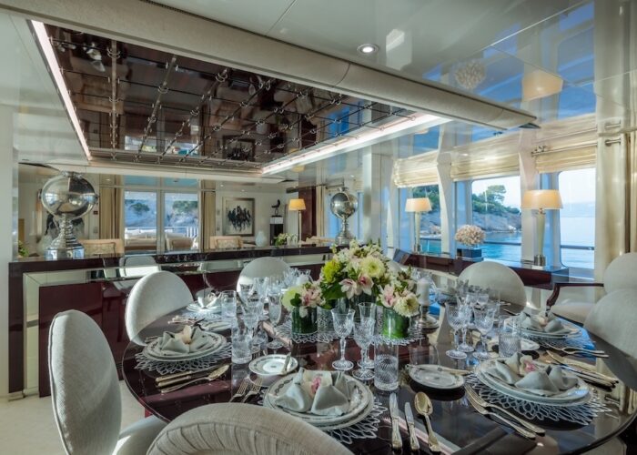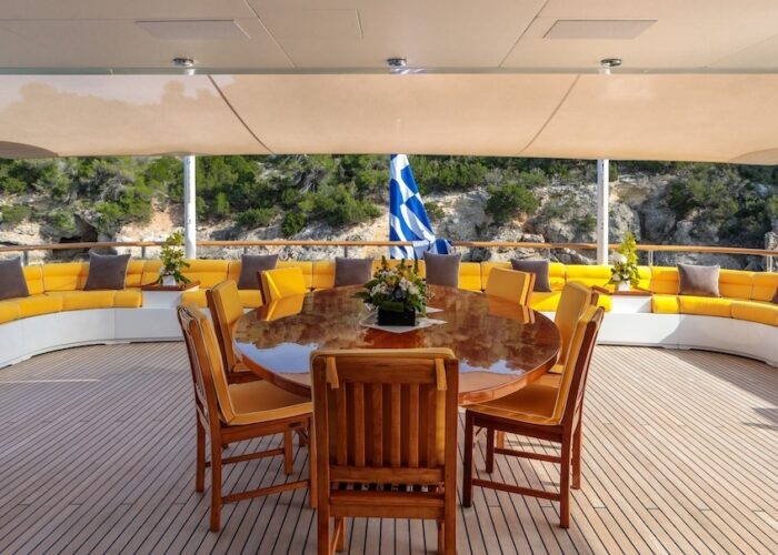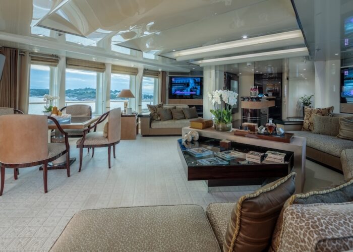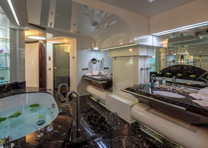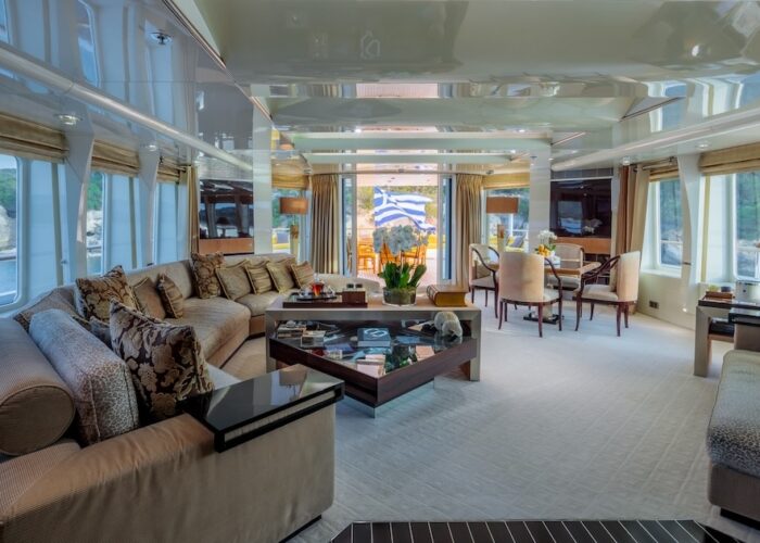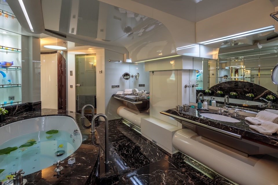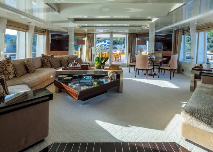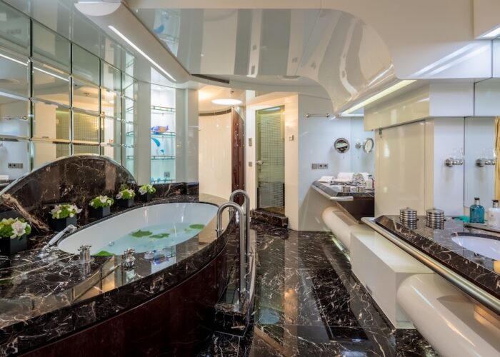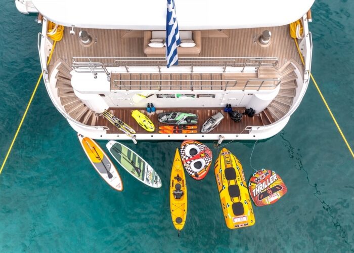 She is very spacious, with special crew passages for clients’ privacy and a private Jacuzzi area. She has also a gym on the lower deck and a vast array of water toys.