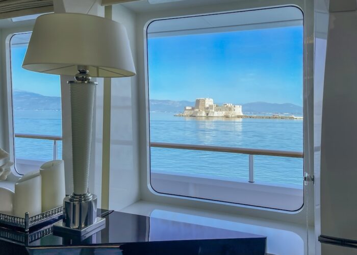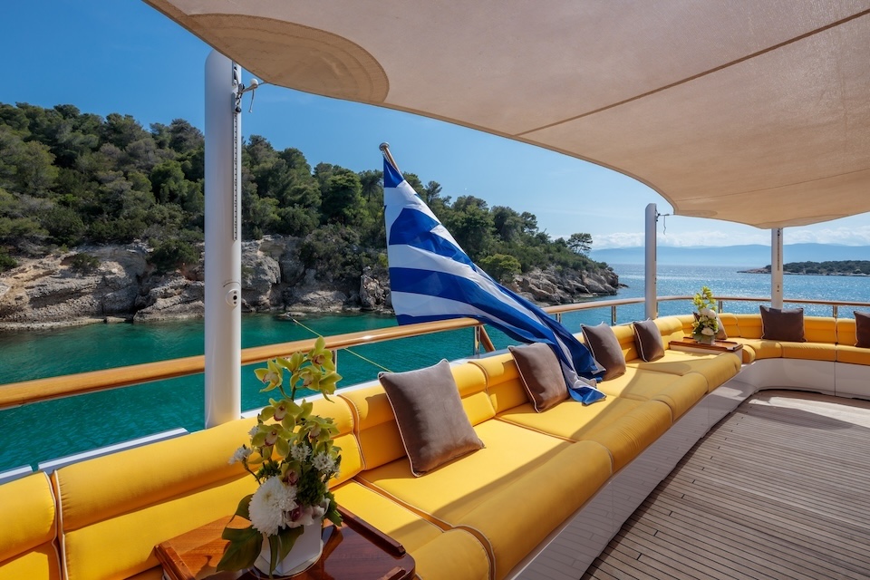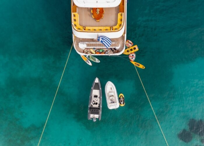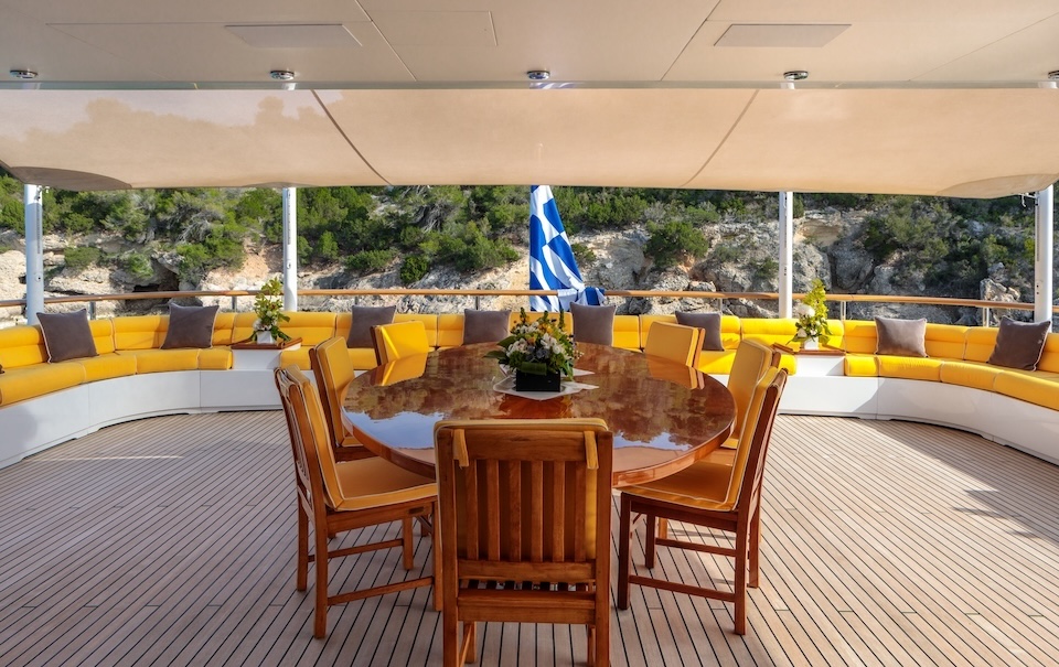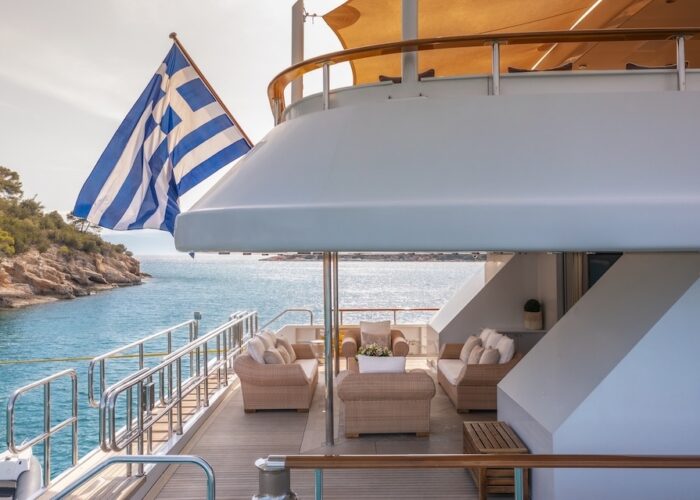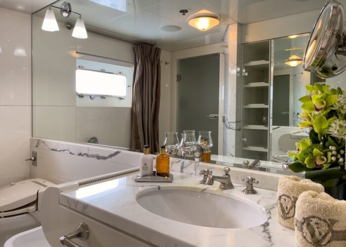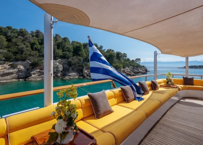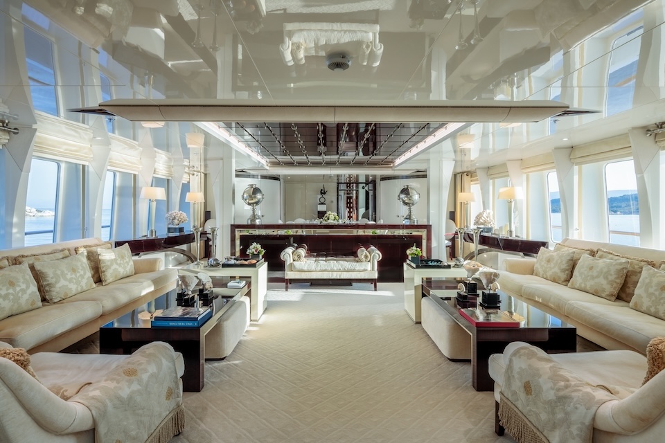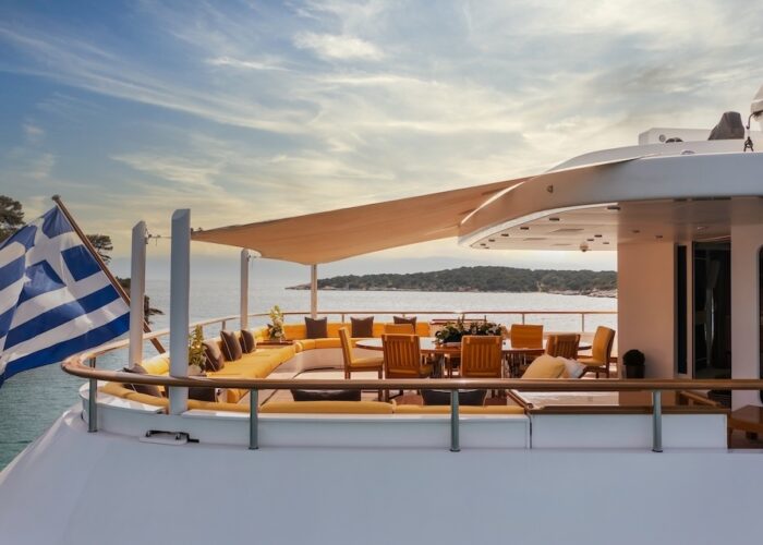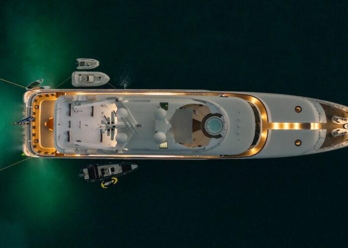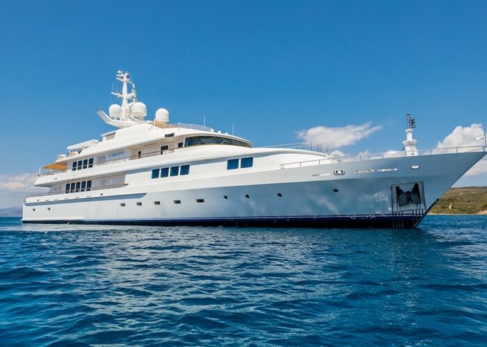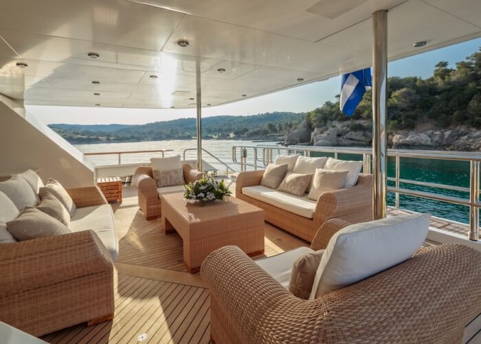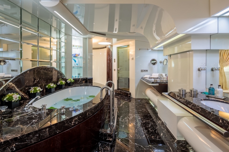 She is very spacious, with special crew passages for clients’ privacy and a private Jacuzzi area. She has also a gym on the lower deck and a vast array of water toys.