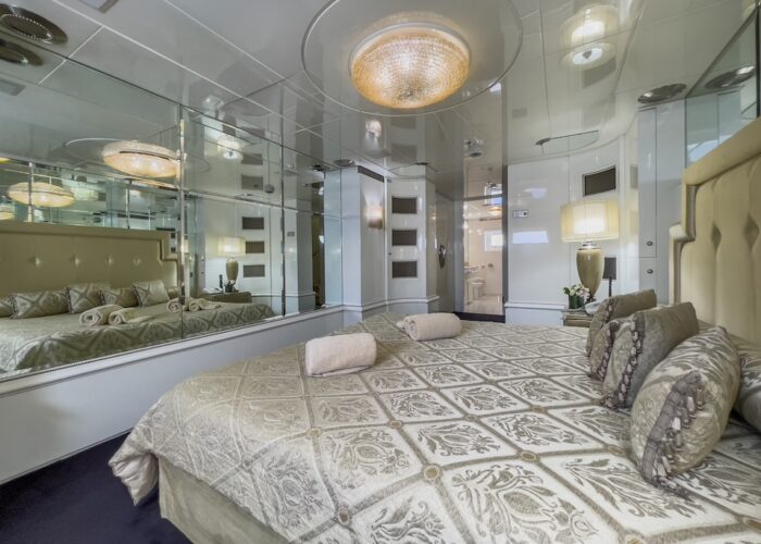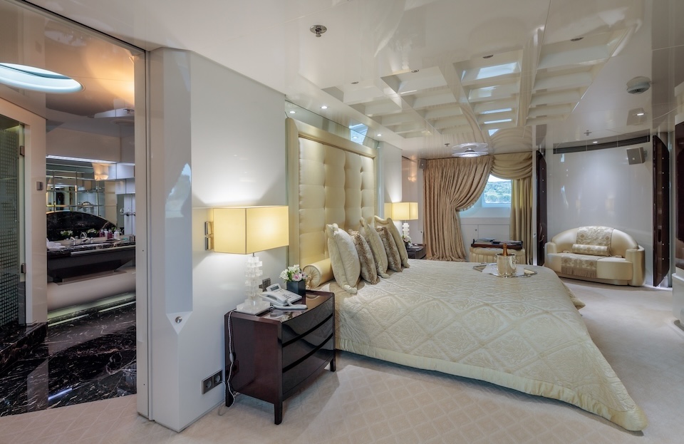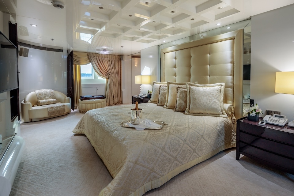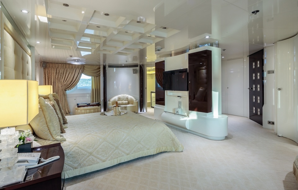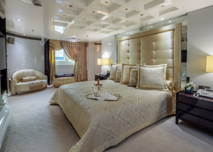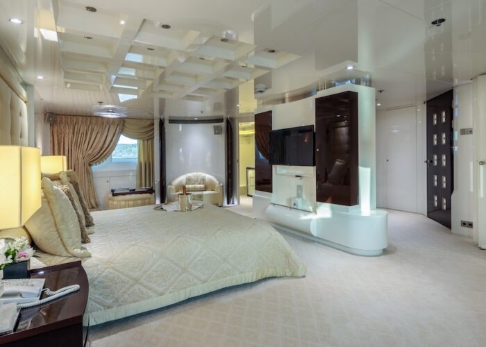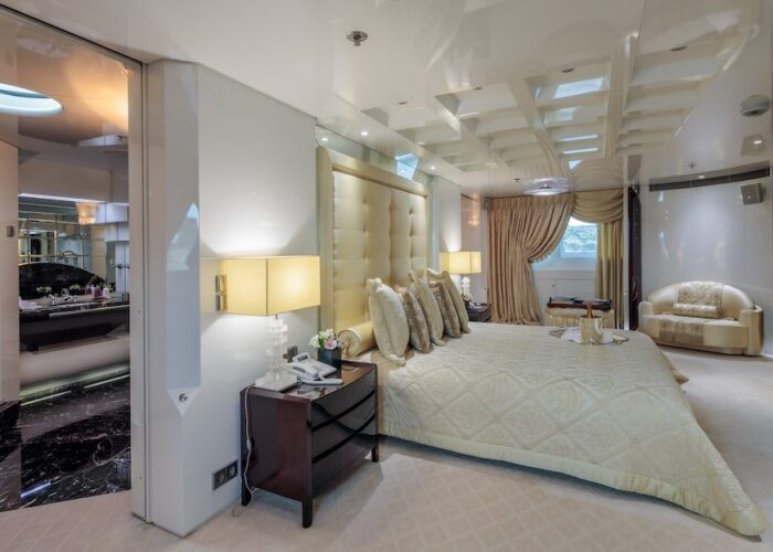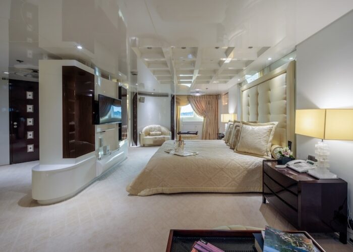 Master cabin with King size bed, his & hers bathroom with jacuzzi & sauna, his & hers walk in closets, mini bar, safe box and an office on the main deck.