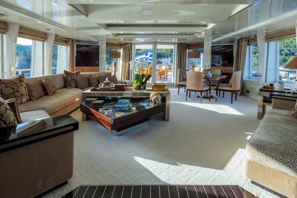 The yacht has light modern interior that is both comfortable and elegant. Her stylish interiors are wonderfully appointed with total unadulterated luxury coupled with contemporary styling. The main saloon has a vast seated lounging area, perfect for a movie night with friends, and also features a lavish formal dining area. The contrasting dark woods and light fabrics give a glamorous feel to this superyacht.