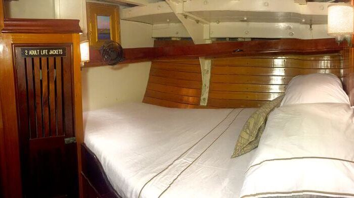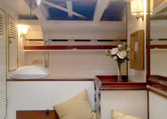 FOC’S’LE Unusually for a sailing ship the foc’s’le is ideal as a guest cabin thanks to its privacy, double berth to starboard as well as a single berth to port, and ample light and fresh air from the deck hatch overhead.